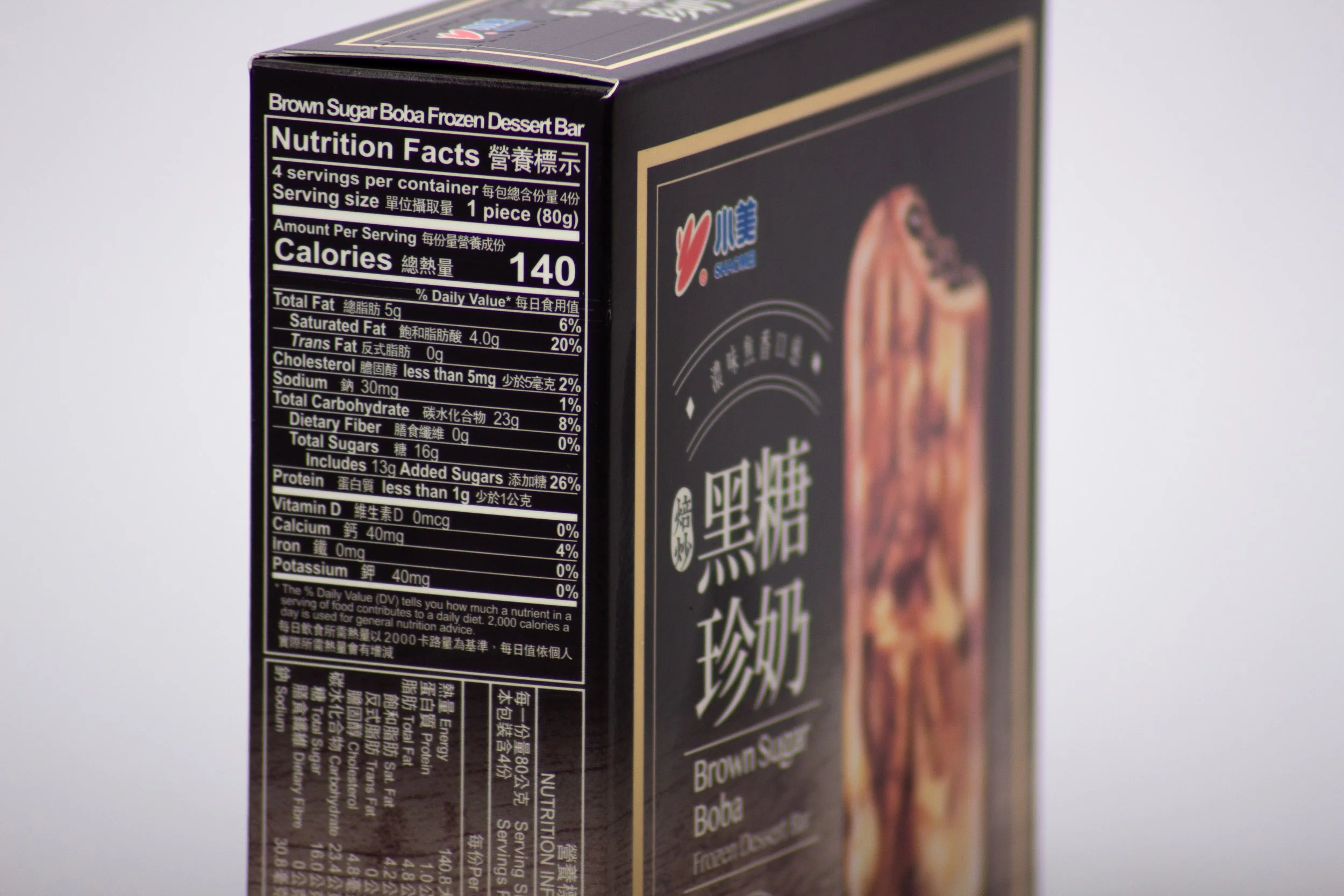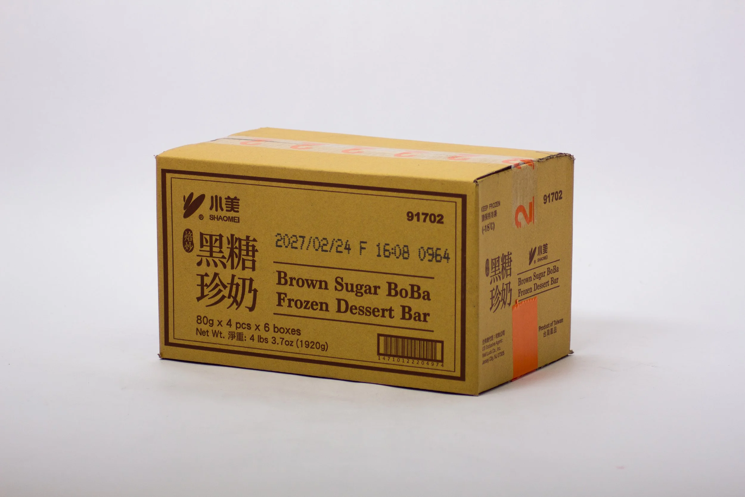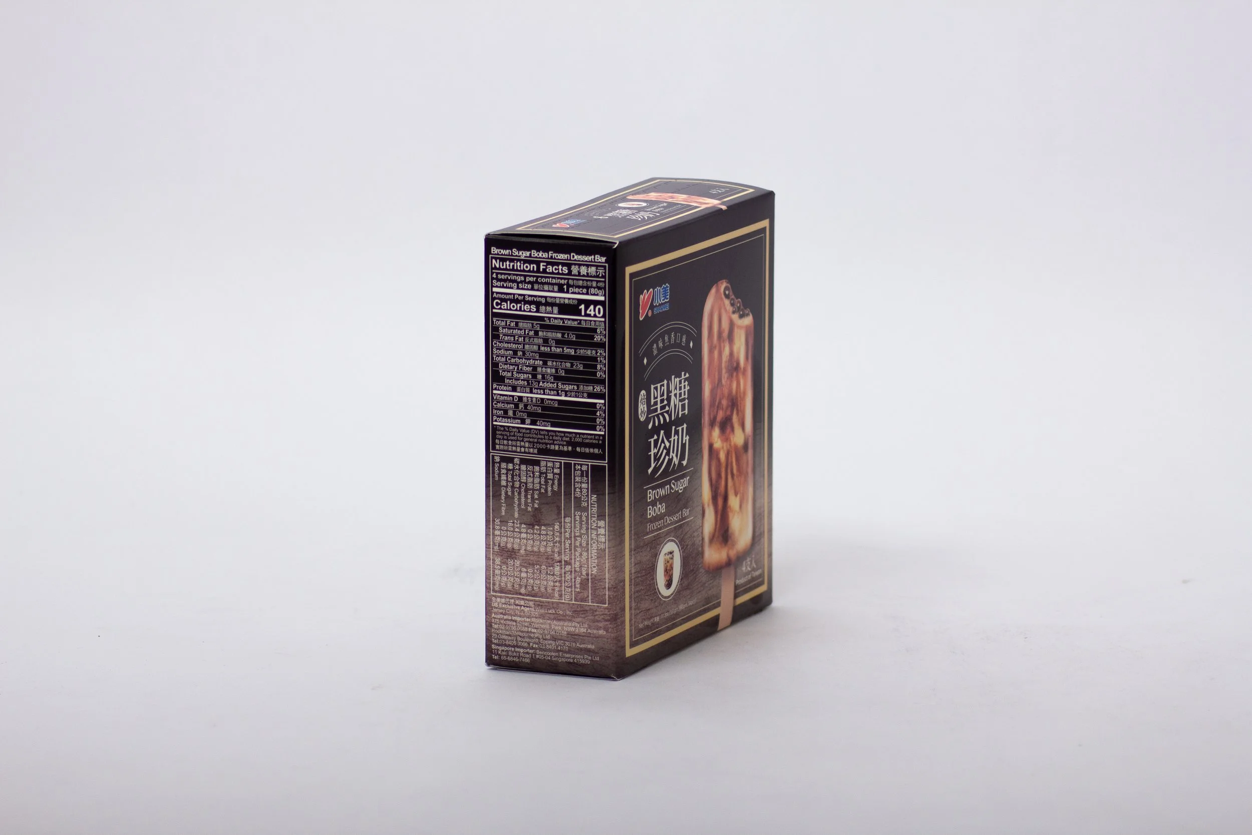 The Shao Mei Brown Sugar Boba Frozen Dessert Bar is a delightful fusion of creamy ice cream and chewy brown sugar-flavored mochi pearls, inspired by Taiwan's beloved brown sugar boba milk tea.Each bar features rich, caramelized brown sugar swirls enveloping a smooth, milky base, complemented by soft, chewy mochi that retains its texture even when frozen.This harmonious blend of flavors and textures offers an indulgent treat that captures the essence of the popular beverage in a convenient, frozen form.